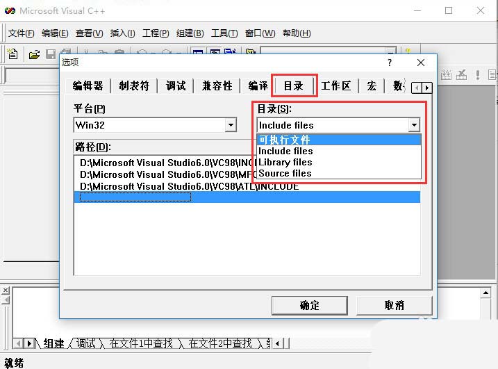 4、首先,我们在“目录(S)”对应的下拉框中选择“可执行文件(executatble files)”,在"路径(D)"(也就是红线框)中可以看到一共有四行路径,黄线框中的代表的是VC++6.0的安装路径,如果不是你的安装路径,请改为安装路径。