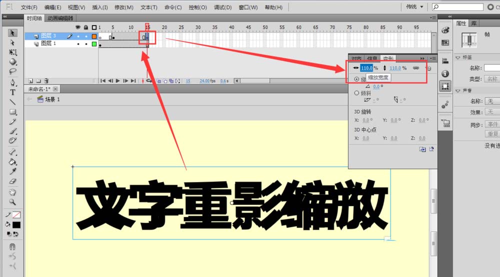 4、在图层2的15帧插入关键帧,然后打开变形窗口,将图层2的第15帧放大110%。