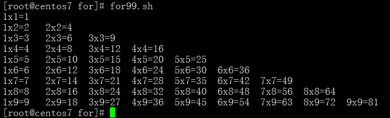 #!/bin/bash#Author:wangjun#Contact QQ:183530300#Version:1.0#Create time:2016-08-18 11:35:16#Description:multiplication table for ((row=1;row<=9;row++));do for ((column=1;column<=$row;column++));do echo -ne "${column}x${row}=$[${column}*${row}]/t" done echodone