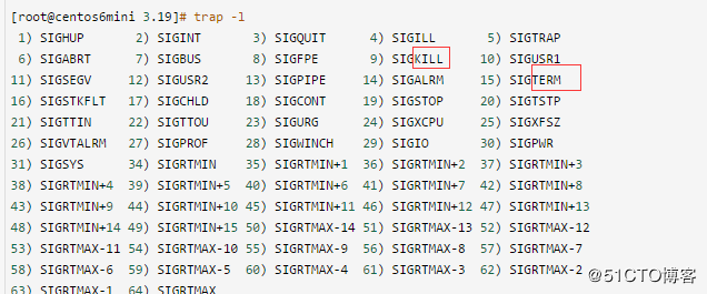 [root@centos6mini 3.19]# trap -l 1) SIGHUP 2) SIGINT 3) SIGQUIT 4) SIGILL 5) SIGTRAP 6) SIGABRT 7) SIGBUS 8) SIGFPE 9) SIGKILL 10) SIGUSR111) SIGSEGV 12) SIGUSR2 13) SIGPIPE 14) SIGALRM 15) SIGTERM16) SIGSTKFLT 17) SIGCHLD 18) SIGCONT 19) SIGSTOP 20) SIGTSTP21) SIGTTIN 22) SIGTTOU 23) SIGURG 24) SIGXCPU 25) SIGXFSZ26) SIGVTALRM 27) SIGPROF 28) SIGWINCH 29) SIGIO 30) SIGPWR31) SIGSYS 34) SIGRTMIN 35) SIGRTMIN+1 36) SIGRTMIN+2 37) SIGRTMIN+338) SIGRTMIN+4 39) SIGRTMIN+5 40) SIGRTMIN+6 41) SIGRTMIN+7 42) SIGRTMIN+843) SIGRTMIN+9 44) SIGRTMIN+10 45) SIGRTMIN+11 46) SIGRTMIN+12 47) SIGRTMIN+1348) SIGRTMIN+14 49) SIGRTMIN+15 50) SIGRTMAX-14 51) SIGRTMAX-13 52) SIGRTMAX-1253) SIGRTMAX-11 54) SIGRTMAX-10 55) SIGRTMAX-9 56) SIGRTMAX-8 57) SIGRTMAX-758) SIGRTMAX-6 59) SIGRTMAX-5 60) SIGRTMAX-4 61) SIGRTMAX-3 62) SIGRTMAX-263) SIGRTMAX-1 64) SIGRTMAX#!/bin/bash trap 'echo “signal:SIGINT"' int # int 相当与Ctrl+ctrap -p for((i=0;i<=10;i++)) do sleep 1echo $i donetrap '' int #trap '' 信号 忽略信号的操作 trap -p for((i=11;i<=20;i++)do sleep 1echo $i done trap '-' int #rap '-' 信号 恢复原信号的操作 trap -p for((i=21;i<=30;i++)do sleep 1 echo $idone