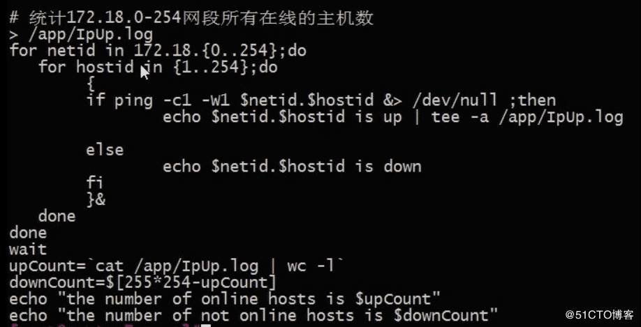 #!/bin/bash #Author:wangjun#Contact QQ:183530300#Version:1.0#Create time:2016-08-17 11:25:37#Description:ping all hosts and count the numberdeclare -i online=0declare -i offline=0declare -i host=1 for host in `seq 254`;do ping -c 1 -W 1 10.1.250.$host &> /dev/null && echo "10.1.250.$host is online" && let online=$online+1 || let offline++doneecho "Online hosts number : $online"echo "Offline hosts number : $offline"