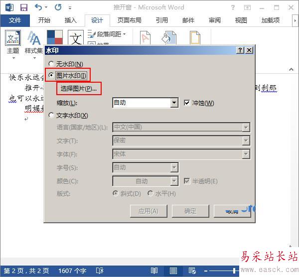 2、此时会弹出一个“水印”对话框,我们选择“图片水印”,然后单击它下面的“选择图片”按钮。