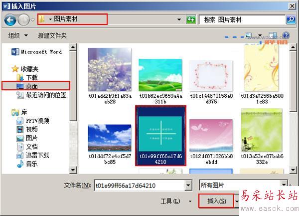 4、我们可以在接下来弹出的“插入图片”对话框中选择自己喜欢的图片,并单击“插入”按钮。例如,我们选择“桌面”中“图片素材”文件夹里的名为“t01e99ff66a17d64210”的文件,然后单击“插入”按钮。