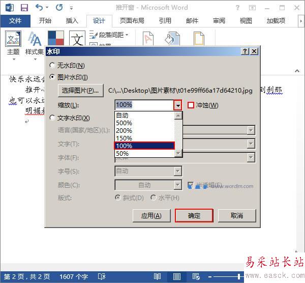 5、此时系统会自动返回“水印”对话框,大家可以根据自己的喜好选择是否冲蚀以及缩放图片。例如:我们现在单击“缩放”下拉框右侧的下拉按钮,选择“100%”选项,并取消对“冲蚀”复选框的选择,最后单击“确定”按钮。