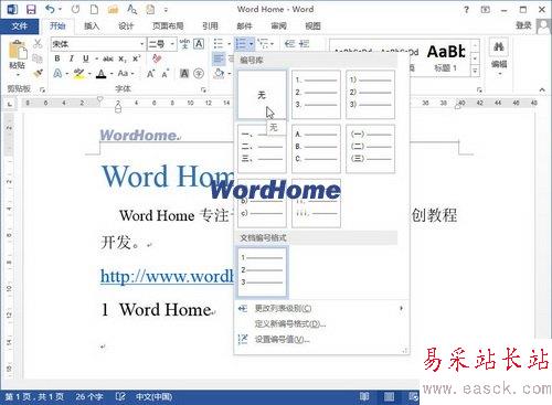 第4步,返回Word2013文档窗口,在文档中输入任意数字(例如输入阿拉伯数字1),然后按下Tab键。接着输入具体的文本内容,按下回车键自动生成编号。连续按下两次回车键将取消编号状态,或者在“开始”功能区的“段落”分组中单击“编号”下拉三角按钮,在打开的编号列表中选择“无”选项取消自动编号状态,如图2013102904所示。