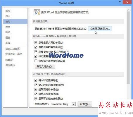 第2步,在打开的“Word选项”对话框中切换到“校对”选项卡,在“自动更正选项”区域单击“自动更正选项”按钮,如图2013102902所示。