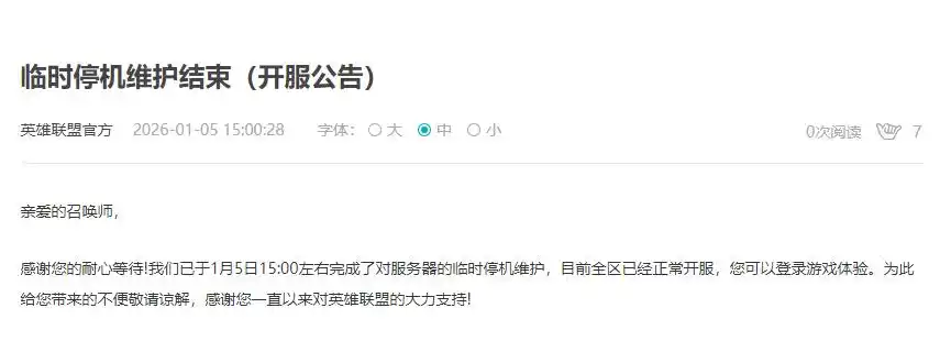 《英雄联盟》全区临时停机维护 客服回应:已完成维护