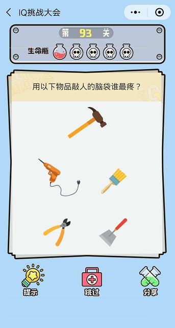 微信IQ挑战大会第93关【用以下物品敲人的脑袋谁最疼】答案攻略 ... [更多详细]