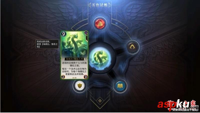 通过这些教学关卡,玩家将迅速了解游戏。通关五色试炼后,玩家不但能获得大量的基础卡牌,还将获得传奇生物卡【海德拉,憎恶之母】,为接下来的实战打好基础。