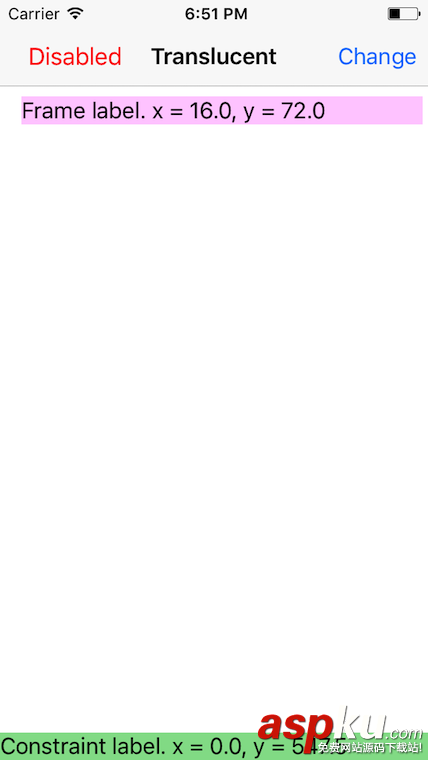 @objc private func rightButtonClicked(_ sender: AnyObject) {navigationController?.navigationBar.isTranslucent = !navigationController!.navigationBar.isTranslucent updateLabelContent()}private func updateLabelContent() { let frameLabelOrigin = frameLabel.frame.origin frameLabel.text = "Frame label. x = /(frameLabelOrigin.x), y = /(frameLabelOrigin.y)" let constraintLabelOrigin = constraintLabel.frame.origin constraintLabel.text = "Constraint label. x = /(constraintLabelOrigin.x), y = /(constraintLabelOrigin.y)" print("/(title)") print("Status bar frame:", UIApplication.shared.statusBarFrame) // (0.0, 0.0, 375.0, 20.0) print("Navigation bar frame:", navigationController!.navigationBar.frame) // (0.0, 20.0, 375.0, 44.0)}通过点击右上角按钮,来查看变化。