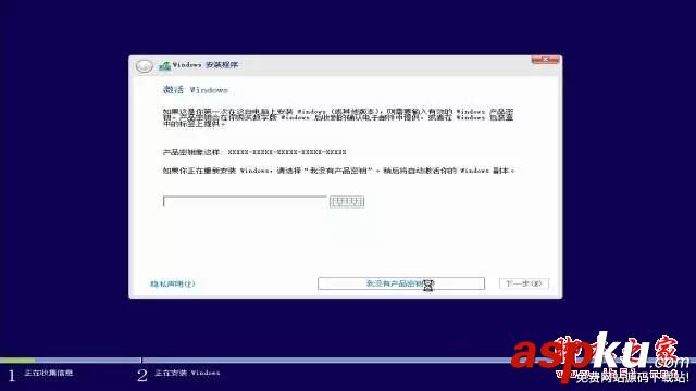 6、然后按照提示进行相应选择就好了,在激活 Windows 这个页面,如果你已经买了 Windows 10 的激活码,直接输入并点击下一步;如果还没有购买,选择【我没有产品密钥】,待进入系统以后再激活也行;