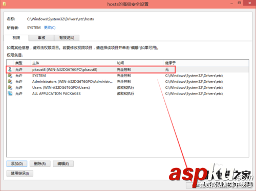 在hosts的高级安全设置界面点击更改权限,如下图所示。