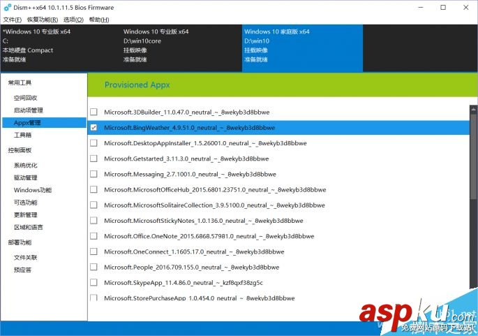 成功加载镜像后在DISM++主窗口点击“打开对话”,切换到“APPX管理”,这里可以根据自己的实际需要对Windows 10内置的应用进行删除,比如“microsoft.bing.weather”对应“天气”应用,如果不要该应用,勾选后点击“删除”即可进行卸载。