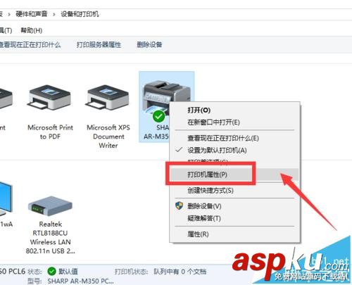 4、在选定的打印机图标上右击-打印机属性,打开打印机属性面板