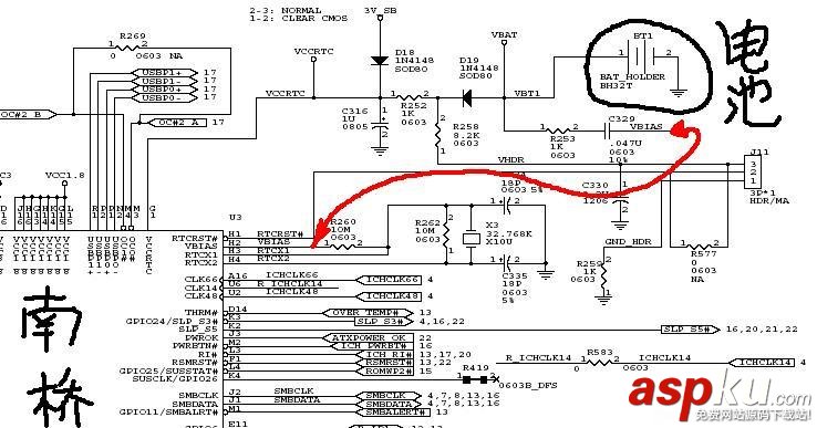 该图中,注意看G1脚VCCRTC,该脚为南桥芯片的供电端。该脚由两路供电:关机状态,由BT1--D19--R252向VCCRTC供电,开机状态,由于3VSB比BAT的电压高,所以D19截止,由3VSB-D18向VCCRTC供电。