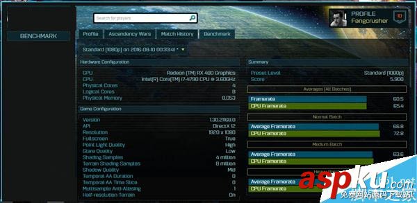 另外此次跑分使用的显卡是RX 480,纵向对比有1080P下四种特效级别,横向对比有标准设定下i5 4670k、i7 4790和FX 8350。