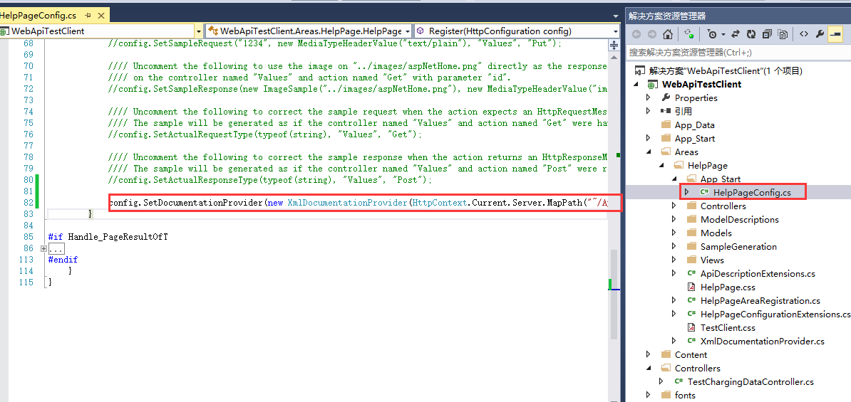 (2)在xml的读取路径:在下图的HelpPageConfig.cs里面配置一句话,指定xml的读取路径。
