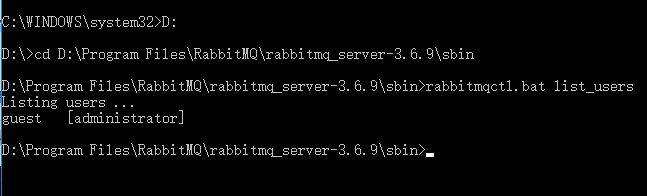 查看已有用户及用户的角色:rabbitmqctl.bat list_users 默认会存在一个来宾账号 guest