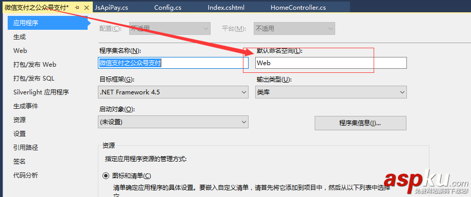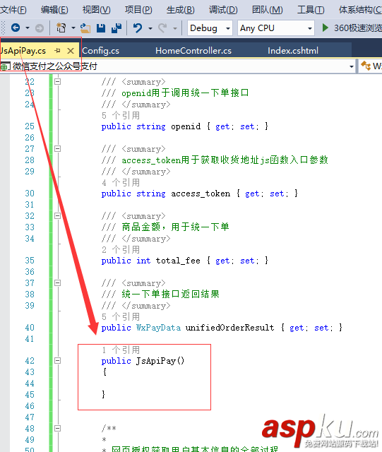 using System;using System.Collections.Generic;using System.Linq;using System.Web;namespace Web.Models{ public class ModelForOrder { public string appId { get; set; } public string timeStamp { get; set; } public string nonceStr { get; set; } public string packageValue { get; set; } public string paySign { get; set; } public string msg { get; set; } }} 还有一个地方需要注意,修改一下的就是这里WxLib/business/JsApiPay.cs,如下图: