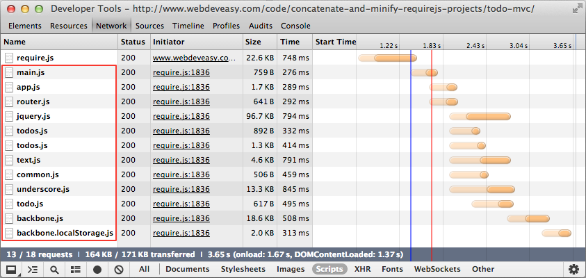 但是,在生产环境中将所有的JavaScript文件分离,这是一个不好的做法。这会导致很多次请求(requests),即使这个些文件都很小,也会浪费很多时间。 可以通过合并这些脚本文件,以减少请求的次数达到节省加载时间的目的。