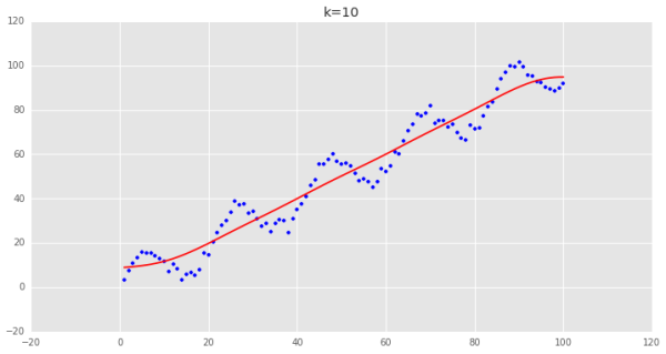 可以看到用普通最小二乘估计出来的值和我们用局部加权估计出来的值非常的一致,说明逻辑是对的。 下面调整一下k的值,来看看各种k值下的拟合状况: