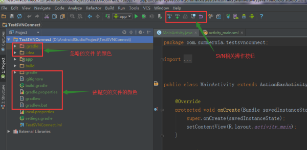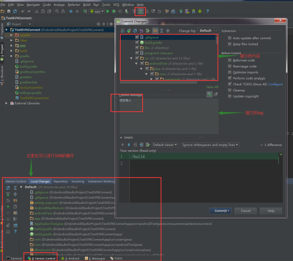 成功后我们就完成了新建项目同SVN的关联及导入项目到SVN服务器上了。关于第一种方式,在将本地代码导入到SVN服务器后将本地代码删除,然后从SVN服务器上将之前提交的代码更新下来,这样一来也可以同SVN建立关联正常进行开发;第一种方式和第二种方式的区别就在于:第一种是将代码先提交到SVN服务器上,然后再从SVN服务器上更新下来(本地项目同SVN服务器建立联系);第二种是先同SVN服务器监理联系,然后将代码提交到SVN服务器上去。建议使用第二种方式进行新项目的SVN关联。四、Android Studio SVN代码冲突的解决在使用SVN更新服务器上的代码时,有时会弹出代码冲突的对话框,问你是否进行合并,并提供了三种合并方案:accept yours(使用你的)、accept theirs(使用别人的)和merge(合并);