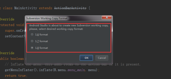 在Define share target下选择第二个可以再trunk下创建你当前项目的文件夹,相应的第一个选项是直接将整个文件都放到trunk文件夹下,第三个在项目文件夹下有创建了一个trunk文件夹,因此建议使用第二中方式;选择完成后点击Share就可以了,会弹出让你选择SVN工作副本的格式化版本(jdk版本),如下图: