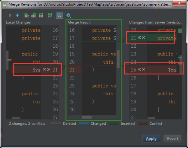 前两个都是进行的覆盖操作,当你选择merge合并时,会弹出代码合并对照窗口,一共有三个屏,左右两侧时你和服务器不同的代码并高亮显示不同的部分,带有箭头和叉号,通过点击箭头将两边冲突的代码添加到中间的合并区域中去,点击叉号则辨识放弃那一段代码,待所有冲突处理完成后merge就成功了。