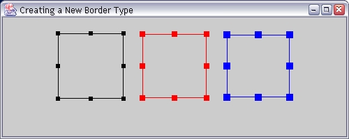 import javax.swing.*;import javax.swing.border.*;import java.awt.*;import java.awt.event.*;public class Test extends JFrame { public static void main(String[] args) { JFrame frame = new Test(); frame.setBounds(100, 100, 500, 200); frame.setDefaultCloSEOperation(JFrame.DISPOSE_ON_CLOSE); frame.show(); } public Test() { super("Creating a New Border Type"); Container contentPane = getContentPane(); JPanel[] panels = { new JPanel(), new JPanel(), new JPanel() }; Border[] borders = { new HandleBorder(), new HandleBorder(Color.red, 8), new HandleBorder(Color.blue, 10) }; contentPane.setLayout( new FlowLayout(FlowLayout.CENTER,20,20)); for(int i=0; i < panels.length; ++i) { panels[i].setPreferredSize(new Dimension(100,100)); panels[i].setBorder(borders[i]); contentPane.add(panels[i]); } }}示例5 使用handleBorder