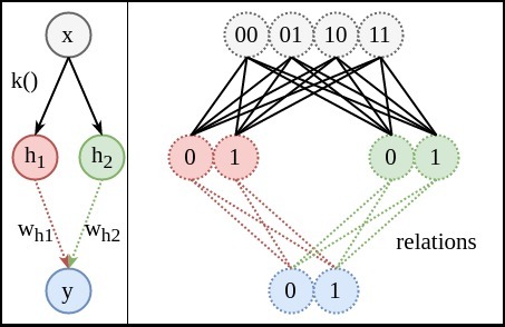 关系图:左侧是网络结构,右侧是状态关系图。输入和输出空间之间共有8个关系(非箭头虚线表示关系)。除非这8个关系对模型来说都是相同的,否则用