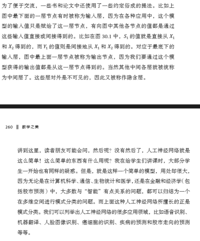 大家可别以为我是在说笑话,这些都是我的亲身经历。首先,我没有遇到过一两小时给我讲懂的好心人,其次我遇到了一批在我前面卖弄的人,作为年轻人,总是希望把自己不明白的东西搞懂,于是我决定去旁听一门课。不过,我听了大约两三次便不再去了,因为除了浪费时间,似乎我并没得到什么收获。好在我自己做研究暂时用不到它,也就不再关心了。后来在美国读博士期间,我喜欢在睡觉前躺着看书,没事儿就捧着几本关于人工神经网络的教科书在床上看,居然也看懂了。然后再用它做了两三个项目,算是学会了。到这时回过头来再看“人工神经网络”,其实并不复杂,入门也不难,只是我走了弯路。——吴军】