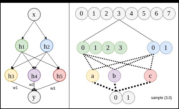 关系图2:与网络结构1不同,增加到4个节点后,每个节点都可以完全没有变体,只取一个值。想法很合理,但实际训练时,模型不按照该方式工作。