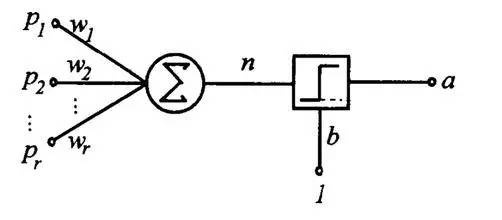 神经元就是当h大于0时输出1,h小于0时输出0这么一个模型,它的实质就是把特征空间一切两半,认为两瓣分别属两个类。你恐怕再也想不到比这更简单的分类器了,它是McCulloch和Pitts在1943年想出来了。这个模型有点像人脑中的神经元:从多个感受器接受电信号