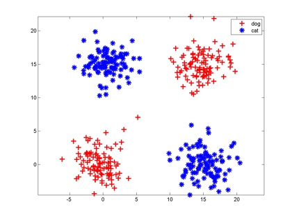 王小龙数学话题优秀回答者 数学,计算机视觉,图形图像处理收录于 知乎周刊 、 编辑推荐 •4320 人赞同神经网络很萌的!0. 分类神经网络最重要的用途是分类,为了让大家对分类有个直观的认识,咱们先看几个例子:垃圾邮件识别:现在有一封电子邮件,把出现在里面的所有词汇提取出来,送进一个机器里,机器需要判断这封邮件是否是垃圾邮件。疾病判断:病人到医院去做了一大堆肝功、尿检测验,把测验结果送进一个机器里,机器需要判断这个病人是否得病,得的什么病。猫狗分类:有一大堆猫、狗照片,把每一张照片送进一个机器里,机器需要判断这幅照片里的东西是猫还是狗。这种能自动对输入的东西进行分类的机器,就叫做分类器。分类器的输入是一个数值向量,叫做特征(向量)。在第一个例子里,分类器的输入是一堆0、1值,表示字典里的每一个词是否在邮件中出现,比如向量(1,1,0,0,0......)就表示这封邮件里只出现了两个词abandon和abnormal;第二个例子里,分类器的输入是一堆化验指标;第三个例子里,分类器的输入是照片,假如每一张照片都是320*240像素的红绿蓝三通道彩色照片,那么分类器的输入就是一个长度为320*240*3=230400的向量。分类器的输出也是数值。第一个例子中,输出1表示邮件是垃圾邮件,输出0则说明邮件是正常邮件;第二个例子中,输出0表示健康,输出1表示有甲肝,输出2表示有乙肝,输出3表示有饼干等等;第三个例子中,输出0表示图片中是狗,输出1表示是猫。分类器的目标就是让正确分类的比例尽可能高。一般我们需要首先收集一些样本,人为标记上正确分类结果,然后用这些标记好的数据训练分类器,训练好的分类器就可以在新来的特征向量上工作了。1. 神经元咱们假设分类器的输入是通过某种途径获得的两个值,输出是0和1,比如分别代表猫和狗。现在有一些样本:大家想想,最简单地把这两组特征向量分开的方法是啥?当然是在两组数据中间画一条竖直线,直线左边是狗,右边是猫,分类器就完成了。以后来了新的向量,凡是落在直线左边的都是狗,落在右边的都是猫。一条直线把平面一分为二,一个平面把三维空间一分为二,一个n-1维超平面把n维空间一分为二,两边分属不同的两类,这种分类器就叫做神经元。大家都知道平面上的直线方程是