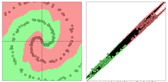 的形状直接倒置了。不过还需要考虑激活函数。(1)中用的是linear。在(2)中,当换成sigmoid时,你会发现没有黄色区域了。因为sigmoid的值域是(0,1)(1)(2)输出:黄色背景颜色都被归为黄点类,蓝色背景颜色都被归为蓝点类。深浅表示可能性的强弱。上图中所有在黄色背景颜色的点都会被分类为“黄点“,同理,蓝色区域被分成蓝点。在上面的分类分布图中你可以看到每一层通过上一层信息的组合所形成的。权重(那些连接线)控制了“如何组合”。神经网络的学习也就是从数据中学习那些权重。Tensorflow playground所表现出来的现象就是“在我文章里所写的“物质组成思想”,这也是为什么我把Tensorflow playground放在了那一部分。不过你要是把Tensorflow的个名字拆开来看的话,是tensor(张量)的flow(流动)。Tensorflow playground的作者想要阐述的侧重点是“张量如何流动”的。5种空间变换的理解:Tensorflow playground下没有体现5种空间变换的理解。需要打开这个网站尝试:ConvNetJS demo: Classify toy 2D data左侧是原始输入空间下的分类图,右侧是转换后的高维空间下的扭曲图。最终的扭曲效果是所有绿点都被扭曲到了一侧,而所有红点都被扭曲到了另一侧。这样就可以线性分割(用超平面(这里是一个平面)在中间分开两类)深层学习为何要“Deep”(下)