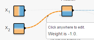 是关于横坐标值的“抛物线”信息。你也可以给更多关于这个点的信息。给的越多,越容易被分开。连接线:表示权重,蓝色表示用神经元的原始输出,黄色表示用负输出。深浅表示权重的绝对值大小。鼠标放在线上可以看到具体值。也可以更改。在(1)中,当把