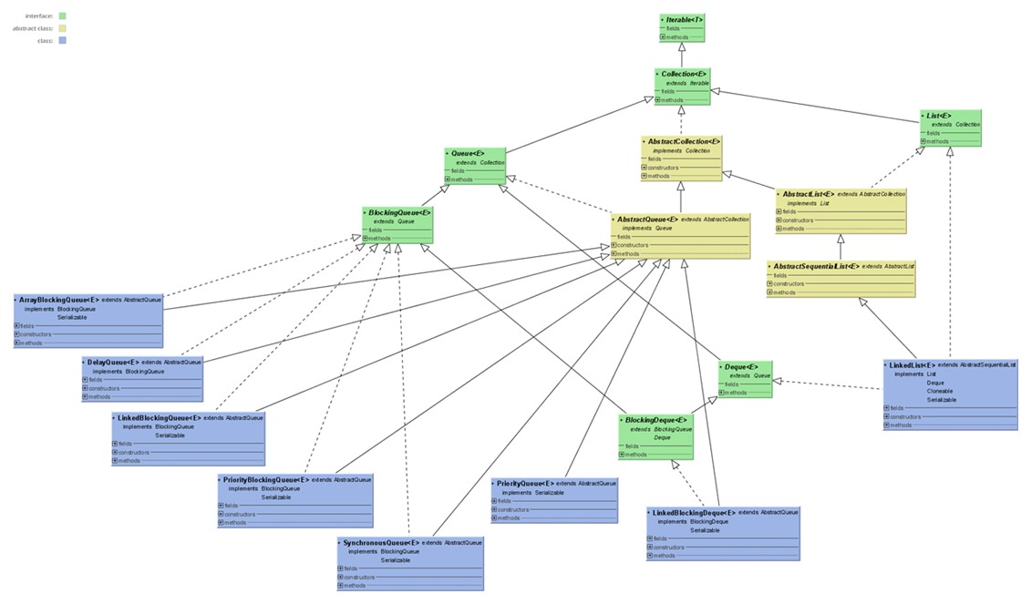 可以看到,java定义了Collection接口和内部集合的基本操作方法,Collection默认可以进行对集合末端添加元素,删除指定元素等操作。List、Set、Queue接口都继承自Collection并定义了各自不同的方法。