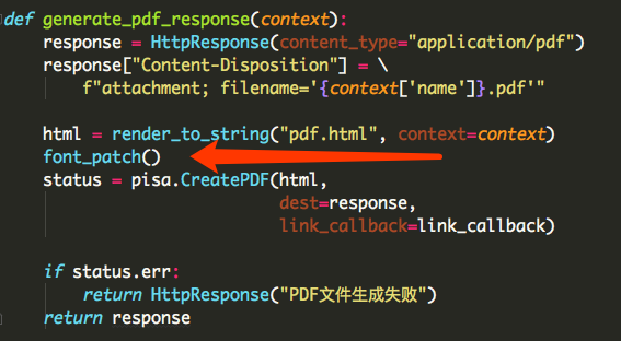 def link_callback(uri): if uri.startswith(settings.MEDIA_URL): path = os.path.join(settings.MEDIA_ROOT, uri.replace(settings.MEDIA_URL, "")) elif uri.startswith(settings.STATIC_URL): path = os.path.join(settings.STATIC_ROOT, uri.replace(settings.STATIC_URL, "")) else: return uri # 确保本地文件存在 if not os.path.isfile(path): raise Exception( "Media URI 必须以以下格式开头" f"'{settings.MEDIA_URL}' or '{settings.STATIC_URL}'") return pathdef generate_pdf_response(context): response = HttpResponse(content_type="application/pdf") response["Content-Disposition"] = / f"attachment; filename='{context['name']}.pdf'" html = render_to_string("pdf.html", context=context) status = pisa.CreatePDF(html, dest=response, link_callback=link_callback) if status.err: return HttpResponse("PDF文件生成失败") return response解决中文乱码问题