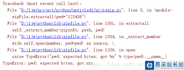 import zipfile zipFile = zipfile.ZipFile("q.zip","r")//这里是我们的压缩文件 zipFile.extractall(pwd="123456")//这里是我们的密码 这段代码其实就是拿着密码去解压我们刚刚压缩的文件,网上大多数教程都是这样写的,但是我这边使用python3.6就会发现运行的时候报错了
