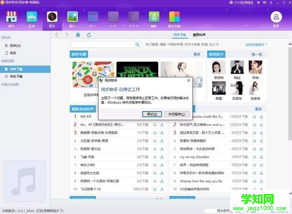 最近有部分win10用户在使用同步助手铃声的过程中会出现“同步助手 已停止工作”,如下图: