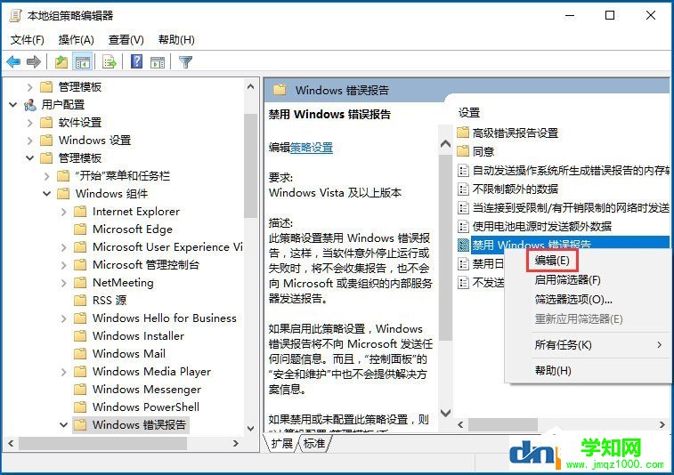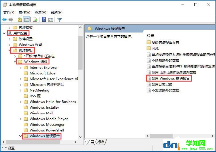 3、打开用户配置→ 管理模板→Windows组件→Windows错误报告→禁用Windows错误报告;