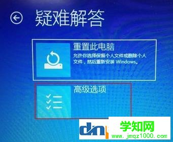 5、在“疑难解答”的设置页面中选择【高级选项】;