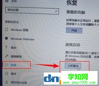3、在新弹出的窗口左侧选择【恢复】。然后再在右侧的“高级启动”下方选择【立即重启】,如图: