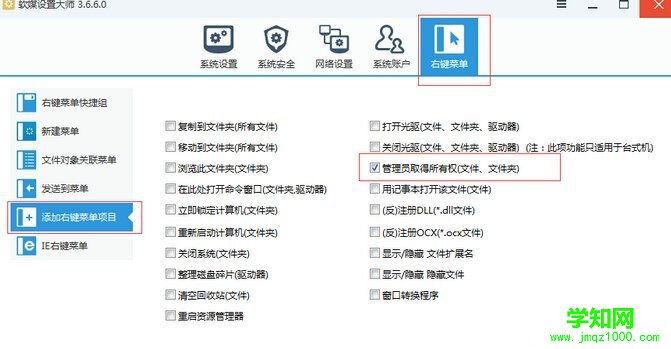 3、在“右键菜单”中的添加“右键菜单”的菜单栏下选中“管理员取得所有权”,设置好后点击“应用”。