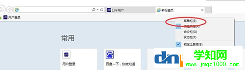 3、第二种设置方法是在工具菜单中进行设置。在IE浏览器顶部右击,菜单栏前打上√。