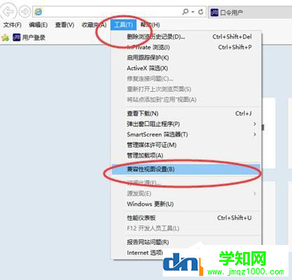 4、在显示出的菜单栏中,单击工具菜单,菜单中选择 兼容性视图设置。之后也会打开兼容性视图设置窗口。