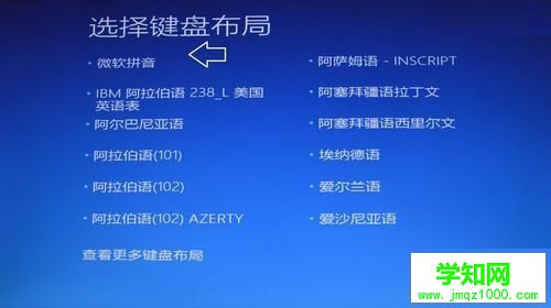 可能要重启三次失败之后,才可能会弹出Windows10的修复菜单,首先是选择键盘布局→微软拼音。