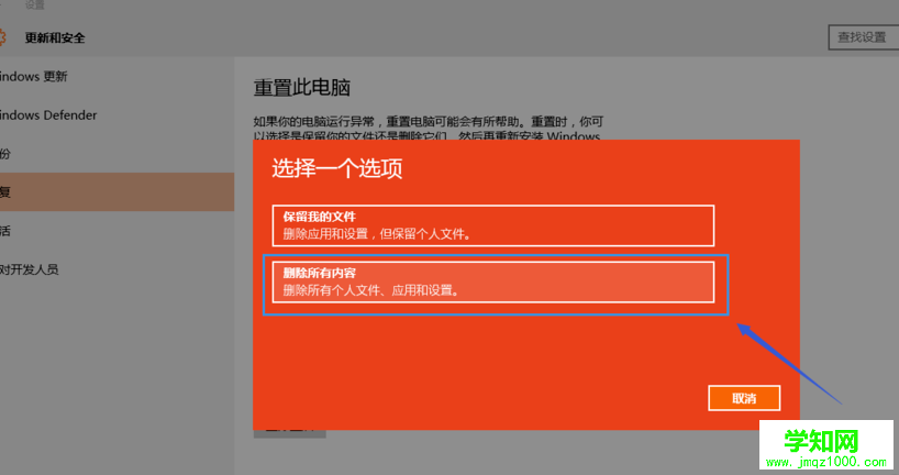 4.这时候会跳出一个提示框,有两个选项,点击 删除所有内容 ,进入下一步。