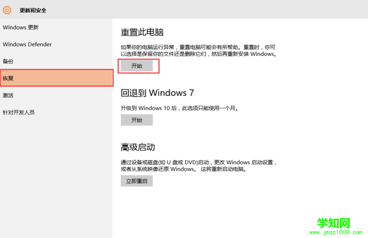 3.在新出现的页面左侧点击 恢复 按钮,接着在右侧找到重置此电脑,点击 开始 。