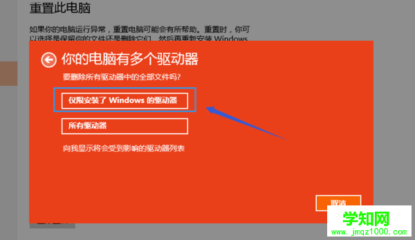 5.稍等片刻后会出现另外一个提示,提示您的电脑有多个驱动器,是否 要删除所有驱动器中的文件吗? ,这里选择 仅限安装了windows的驱动器,进入下一步。